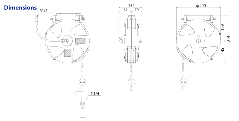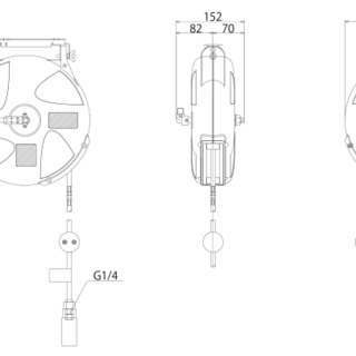 Compact and light-weight air hose reel with durable and flexible 1/4" x 10M hose.